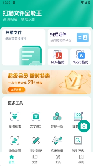 1、首页配备了扫描文件、扫描证件功能,以及PDF格式、Word格式转换工具,另有更多实用工具可供使用;