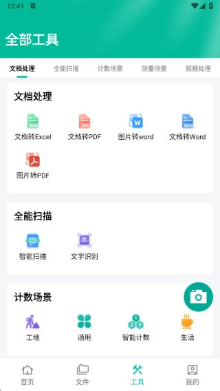 4、工具内集成了文档处理、全能扫描、计数场景、测量场景以及视频处理等功能。