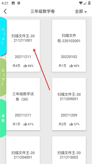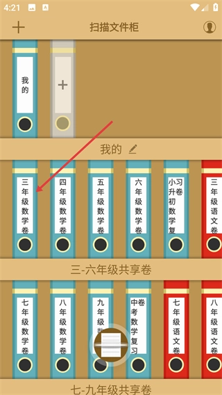1、在扫描文件柜页面挑选目标文件分类(例如【三年级数学卷】),进入该分类对应的文件列表页面。