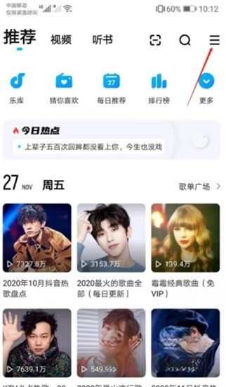 1、启动酷狗音乐概念版应用,接着点击界面右上角呈现为三条横线样式的图标。