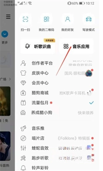 2、在弹出的菜单中,找到并点击音乐应用选项。