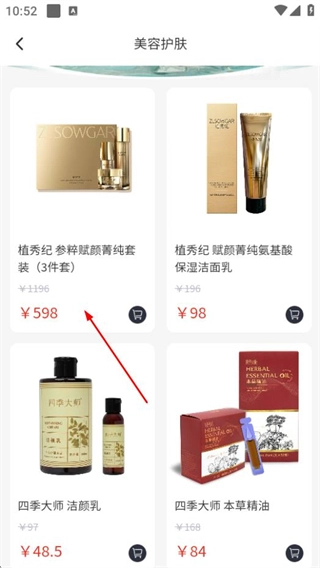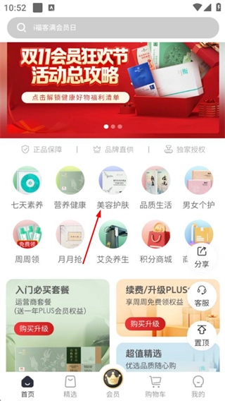 1、启动i福客满应用,点击“美容护肤”选项,即可进入美容护肤类商品的分类页面。