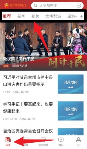 1、在首页界面可查看推荐新闻资讯,点击顶部栏目切换至推荐、视频、文明梨城等频道。