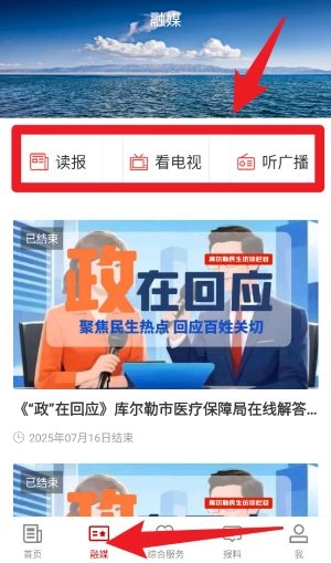 2、进入融媒栏目后,可选择读报、看电视或听广播等功能,方便用户在线获取多种形式的本地媒体内容。