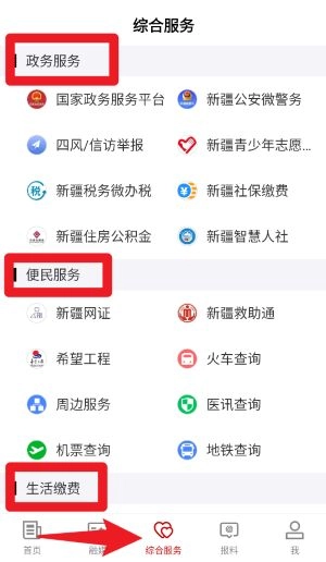 3、在综合服务界面,用户可使用政务服务、便民服务和生活缴费等功能,满足政务办理与日常生活需求。