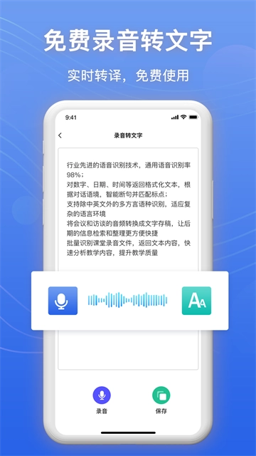 免费录音转文字是一款集录音转文字、文字提取、实时录音转译等多项功能于一体的专业录音文字转换软件。很多时候我们无法快速打字记录别人说了什么,那么你只需要打开软件的录音功能,它可以将录音实时转换为文字,十分方便高效!