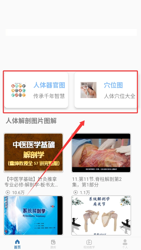 1、打开软件进入首页,就能看到清晰的人体器官图和穴位图板块,方便你快速查找感兴趣的。