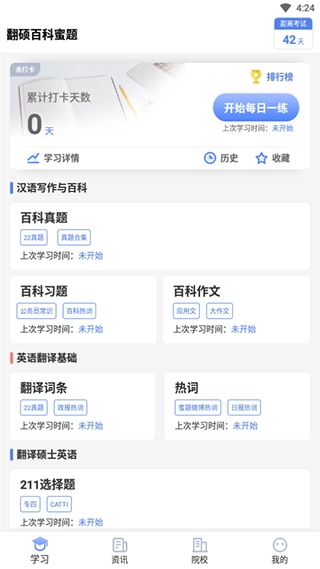 学习界面支持每日一练、百科真题、百科习题、百科作文、翻译词条、热词等功能的使用。