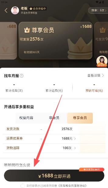 D套餐:3688元,包含10000条货源,每条费用0.37元。
