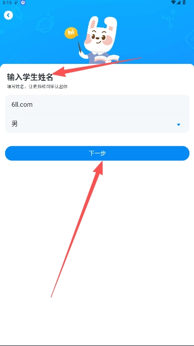 5、为便于老师管理,请输入学生用户姓名并选择性别,以便继续进行下一步操作。