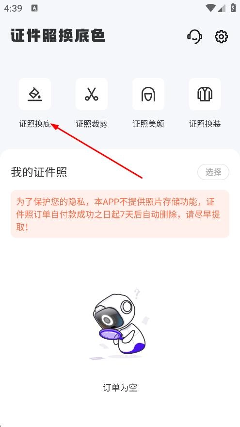 1、在证件照换底色页面,点击证照换底,进入图片选择页面。