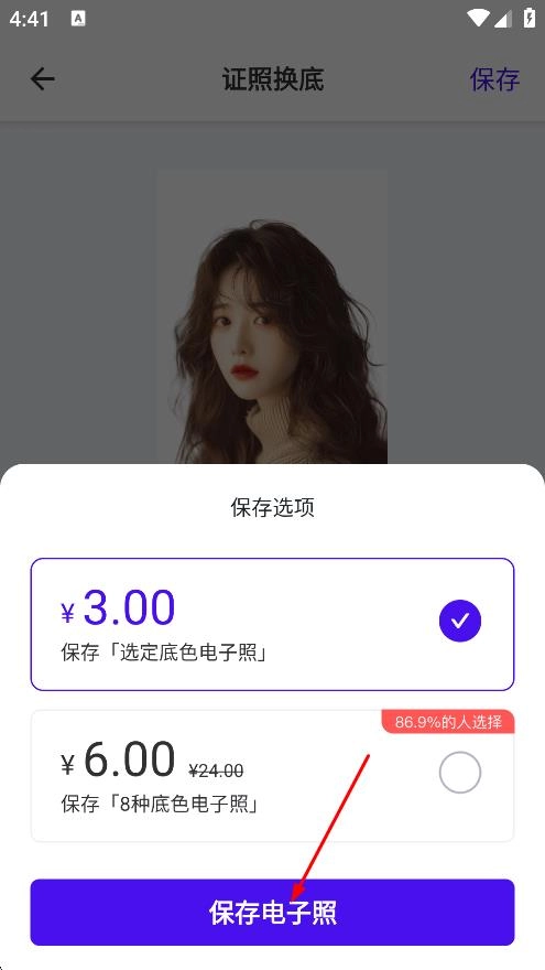 4、在保存选项弹窗中,选择保存选项后,点击保存电子照,完成证件照换底保存。