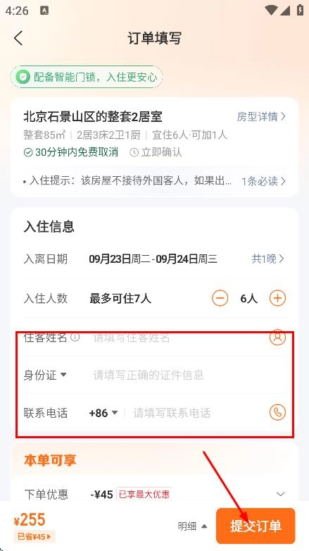在填写完入住信息等相关内容后,点击提交订单按钮,即可完成民宿的预订流程。