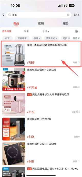 在品质家电分类页面,选择美的品牌,进入美的品牌商品列表页面。