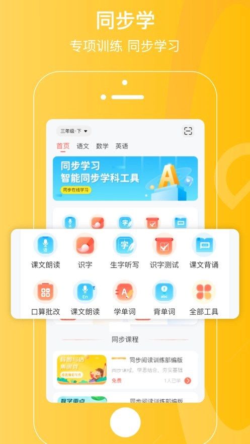 【同步学】是一款和教材课本内容同步的学习工具,覆盖语文、数学、英语学科,能帮助用户开展识字、听写、单词口语、口算等专项学习训练。
