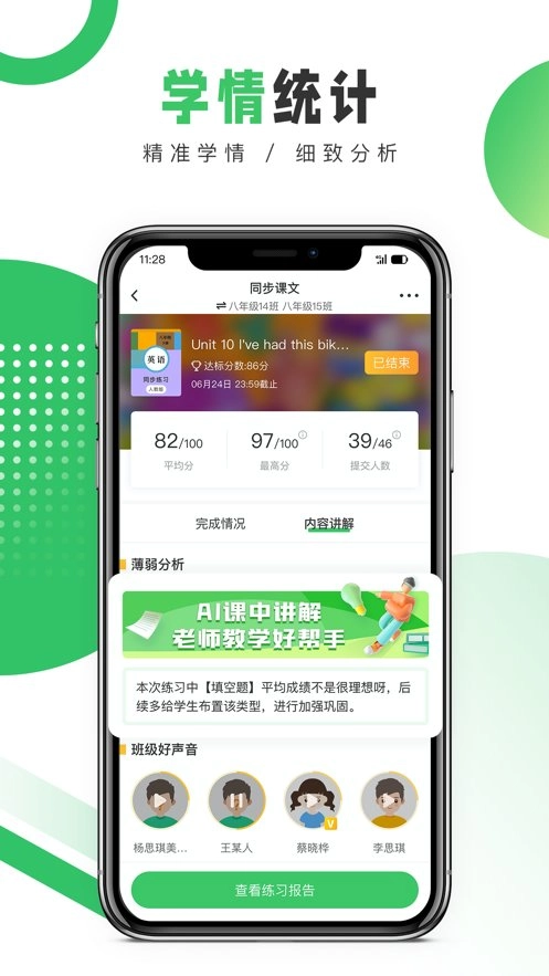 AI智能批改练习,助力老师告别传统批改工作;全面呈现学生练习情况,涵盖题型分析、班级整体表现、薄弱环节等内容。