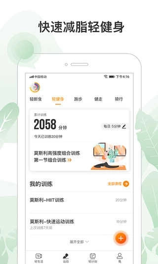 轻健身轻断食,健身搭配饮食,不受时间、场地、器械限制,根据用户不同训练阶段选择个性化训练视频,随时随地随手健身,快速减脂。