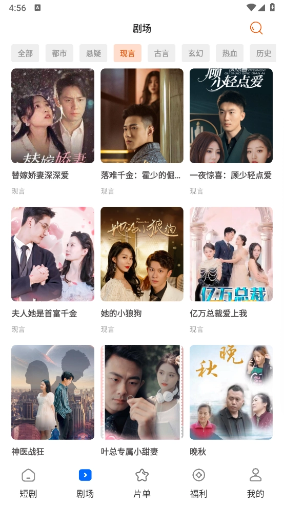 2、来到首页,详细的短剧分类,言情、科幻以及热血等。