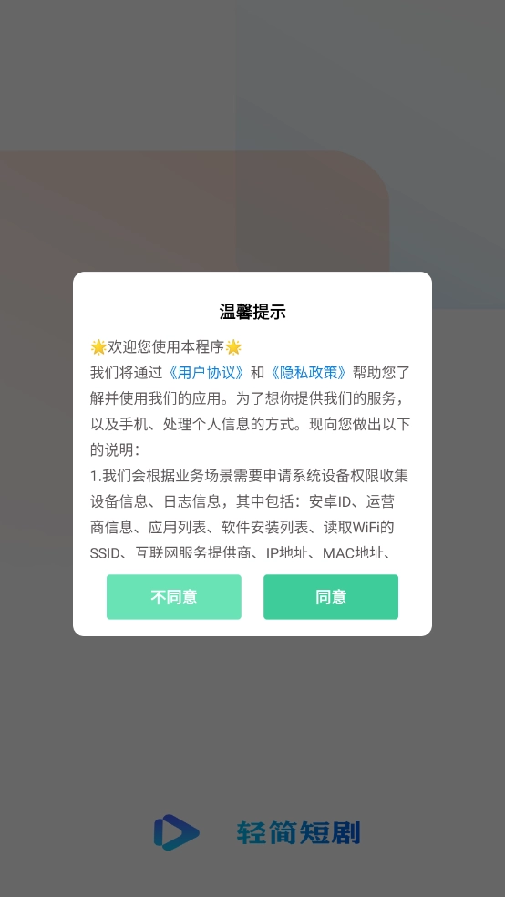 1、安装好轻简免费短剧,查看并同意相关政策与协议。