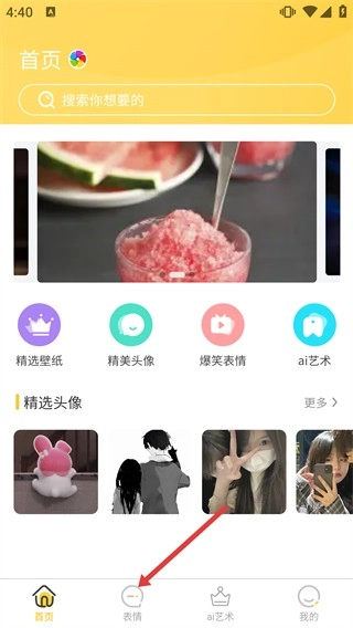 1、进入软件后先查看【首页】界面,可通过顶部搜索栏查找内容,点击【表情】功能入口使用。