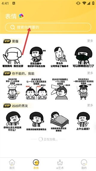 2、切换到【表情】页面,通过顶部搜索栏找表情包,页面展示带【VIP】标识的表情,点击分类旁“更多”可看更多。