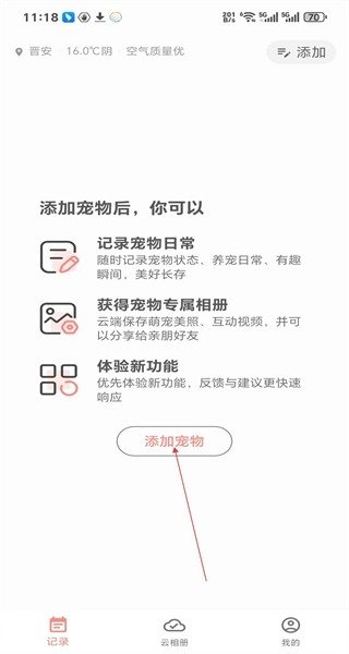 1、打开软件后,看到添加宠物后的功能介绍,找到页面中的添加宠物按钮并点击。