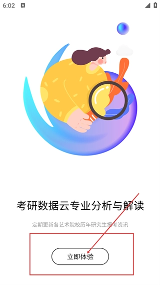 1、点击【立即体验】进入【考研数据云专业分析与解读】服务,该服务定期更新各艺术院校历年研究生报考资讯,开启考研信息查询。