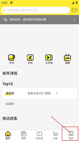 2、在首页点击底部【我的】进入对应页面,首页还设有【史论】-【手绘】-【公共课】-【直播】等功能入口,可访问相关内容。