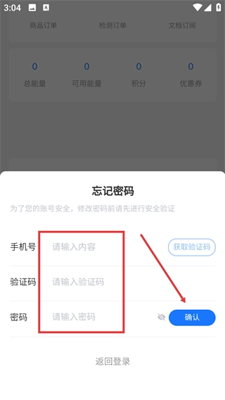 2、在忘记密码界面,依次填写手机号、获取并输入验证码、设置新密码后,点击“确认”完成密码重置。