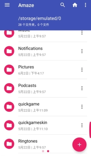 「Amaze文件管理器」的界面设计十分简约,视觉体验舒适;文件布局清晰明了,查找文件轻松快捷。页面上会显示当前窗口包含的文件夹与文件数量,让查找更省心;每个文件下方标注了日期,方便通过日期追溯文件;此外还可使用顶部的搜索工具,进一步提升查找效率。