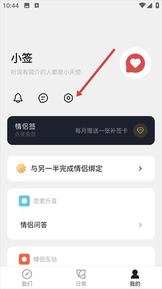 1、在情侣签的【我的】页面,点击对应图标,就能进入设置相关的入口啦。