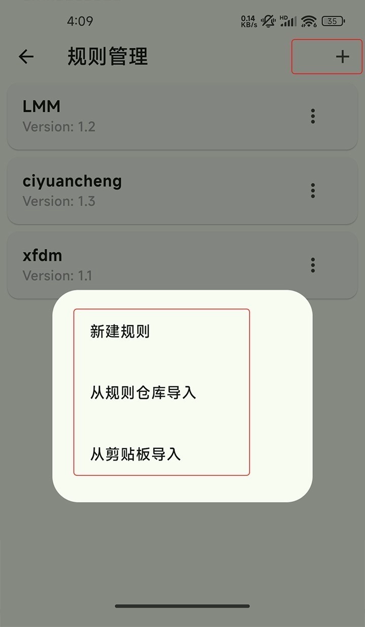 2、点击“+”号就能添加规则,既可以自行创建新规则,也能选择导入规则。