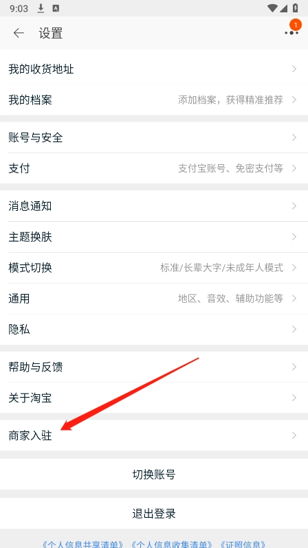 设置页面,点击商家入驻选项。