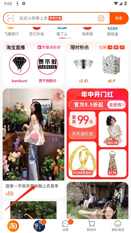 在淘宝页面,点击【商品】。