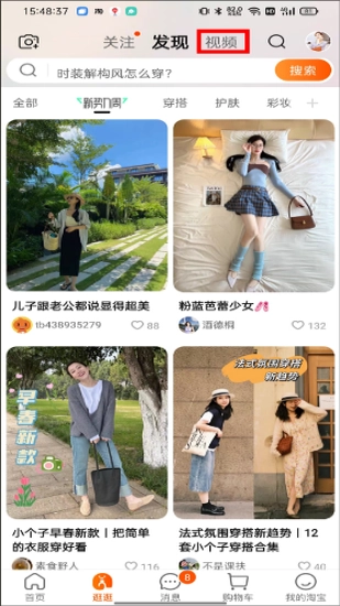 进入逛逛页面后,点击顶部的【视频】按钮,即可进入短视频页面。