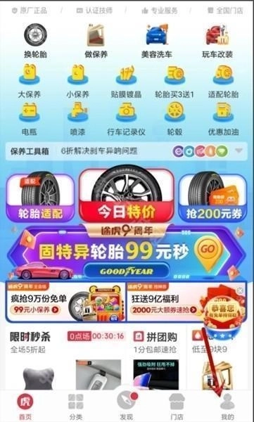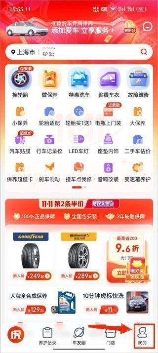 1.接着安装途虎养车应用,安装完成后打开该软件,在首页点击“我的”选项,通过手机号或者微信等方式注册账号。