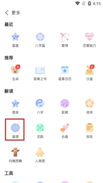 2、找到解读大栏里的“星宿”选项并点击,其中会显示依据用户个人信息预测得出的星宿内容。