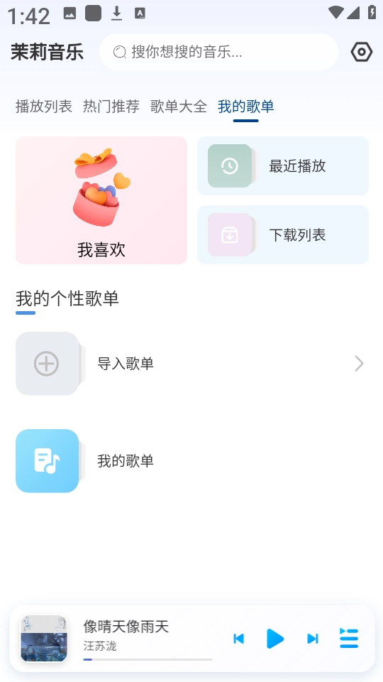1、打开茉莉音乐后,点击顶部导航栏中的“我的歌单”选项。