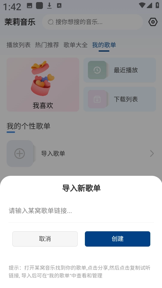 2、接着输入某歌单链接之后,点击“创建”即可。