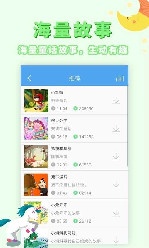 讲故事听故事是许多家庭给孩子准备的睡前必备内容,里面包含了大量适合早教的故事。平台拥有百万级的儿歌与故事资源,覆盖0-12岁孩子及其家长的需求。特别配备了精准的逐字歌词,方便宝宝边听边跟着学习!此外还提供胎教音乐、童谣、儿童故事、睡前童话、唐诗三字经、作文朗诵、少儿英语、百科全书等多种有声读物。深受妈妈和宝宝的喜爱。平台故事资源丰富,并且每天都会更新。