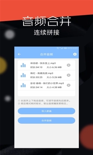 2,音频合并:无缝合拼接各类音频,编辑自己喜爱的音频MP3。