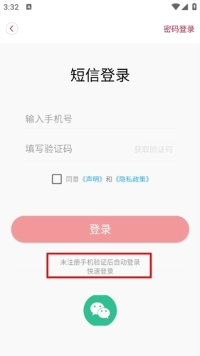 在短信登录界面输入个人手机号,接收验证码并勾选同意相关条款后,就能完成登录操作;若使用的是从未登录过的新手机号,系统会直接完成注册流程。