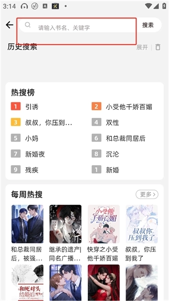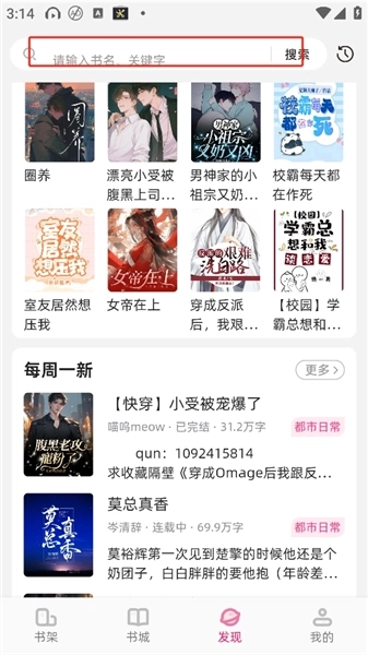 1、打开海棠书城App,进入书城首页后,点击搜索栏即可通过书名进行搜索;