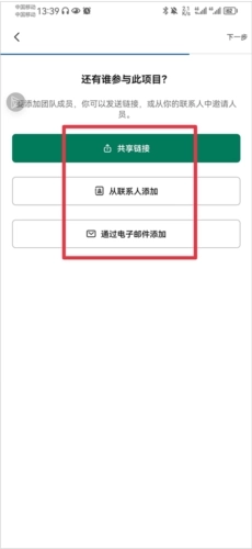 4、创建完成后就可以将链接发送给团队成员,也可以从联系人或者通过电子邮件添加