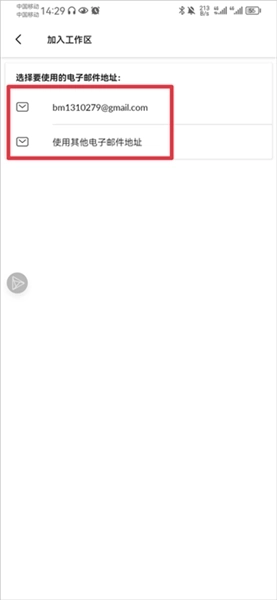 4、最后选择你要使用的电子邮件地址,如果有管理员向你发送邀请时,当你使用该电子邮件进入后就会有邀请链接,点击链接即可加入新的工作区