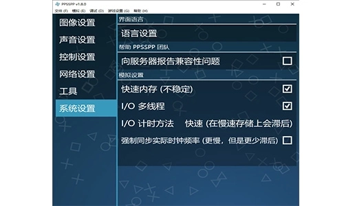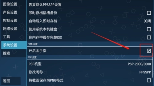 1、启动ppsspp程序,接着依次点击游戏设置、系统设置,最后勾选开启金手指选项。