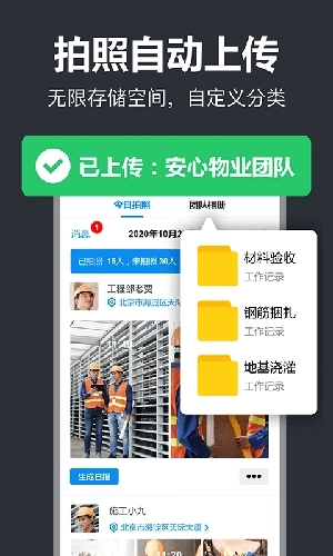 拍照自动同步至团队,自定义分类存储,免费无限存储,随时查看和批量导出,不占用手机空间,节省手机内存。