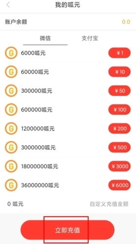 2、在我的呱元页面中选择要充值的金额,点击立即充值按钮就可以了。