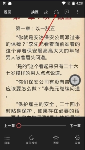 1、用户进入要听的小说内,点击页面中的任意位置,在弹出界面点击上方听书按钮;