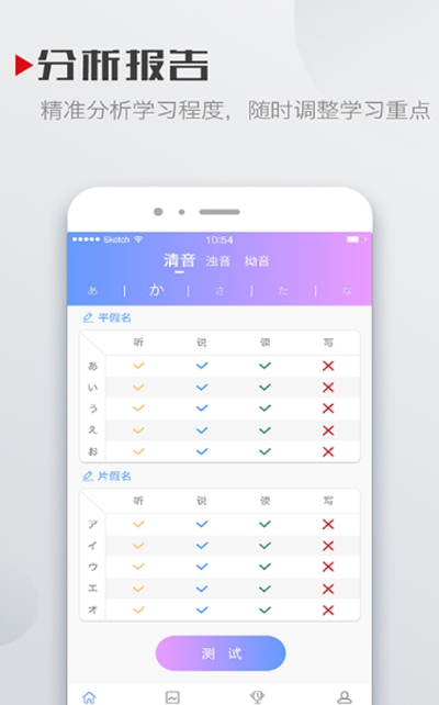 每个假名练习完成后,都会从听说读写四个维度生成分析报告。通过报告可以精准的看到自己学习中的薄弱环节,然后再通过复练的形式重点补充学习薄弱的维度。